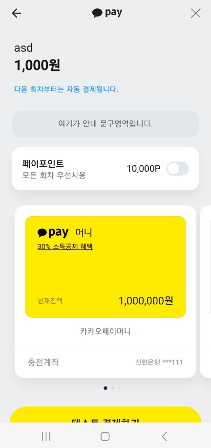 { "bypass": { "kakaopay": { "custom_message": "여기가 안내 문구영역입니다." } } }custom_message: 결제 화면에 보여줄 사용자 정의 문구입니다.(카카오페이와 사전 협의 필요)- 해당 필드를 채워서 요청할 시 아래와 같이 카카오페이 결제창 내에서 문구가 띄워집니다.