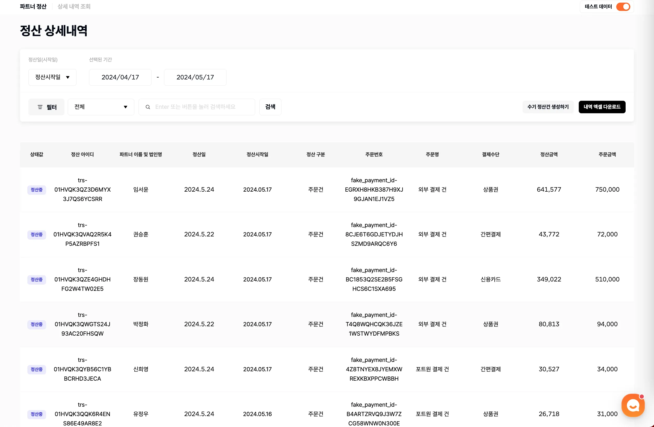- [상세 내역 조회] 페이지에서 정산 상세 내역을 CSV 파일로 다운로드할 수 있습니다.